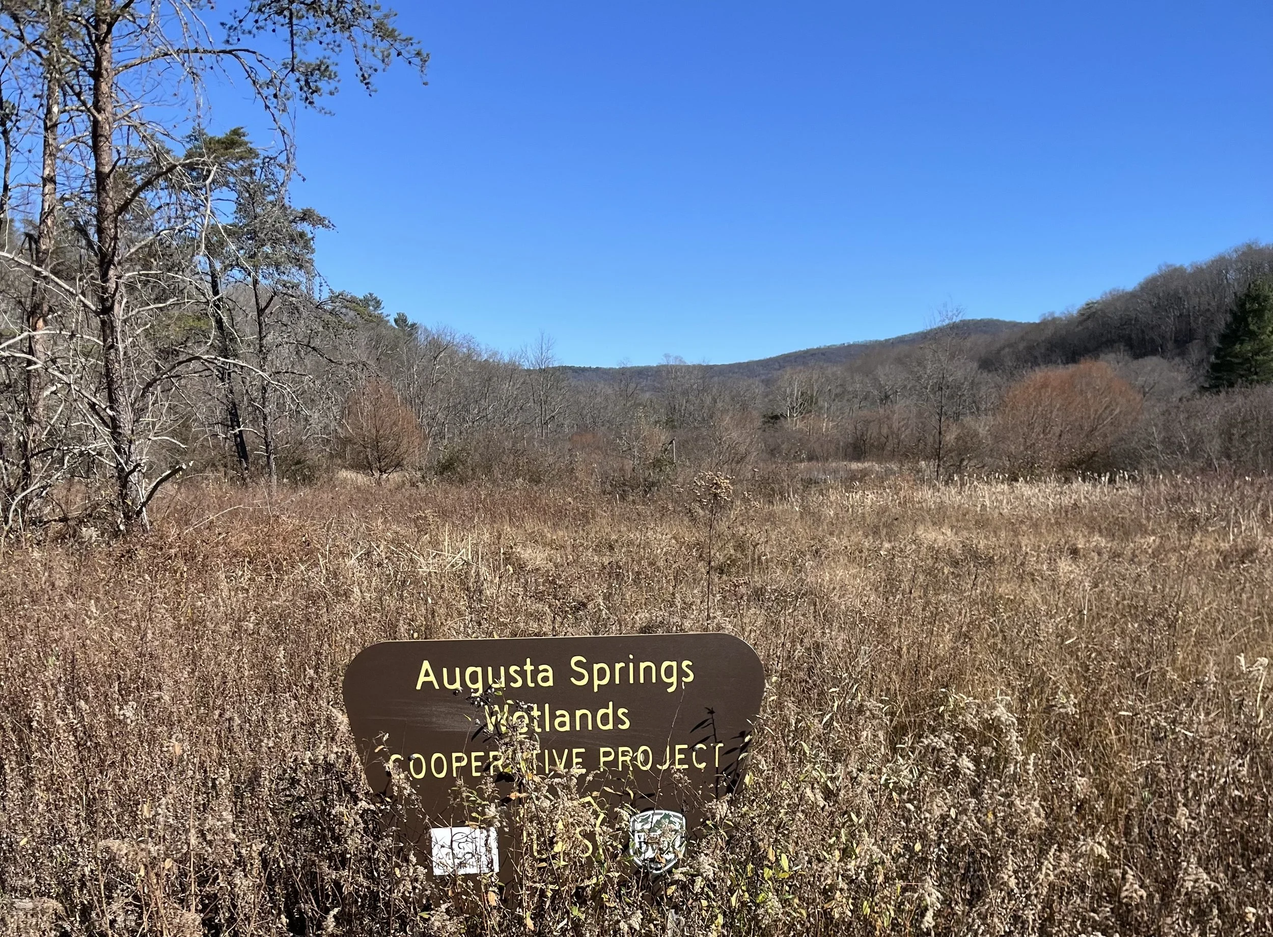 Our first stop was the Augusta Natural Springs Wetlands in the George Washington National Forest. The easy walking loop winds through beautiful marshlands and carries a quiet, “old retreat” charm — the kind you can still feel from its days as a 1850s resort that bottled natural spring water. Archie and Saydie were immediately alert, ears perked at the sounds of birds and noses sniffing all the new scents of the wetlands.