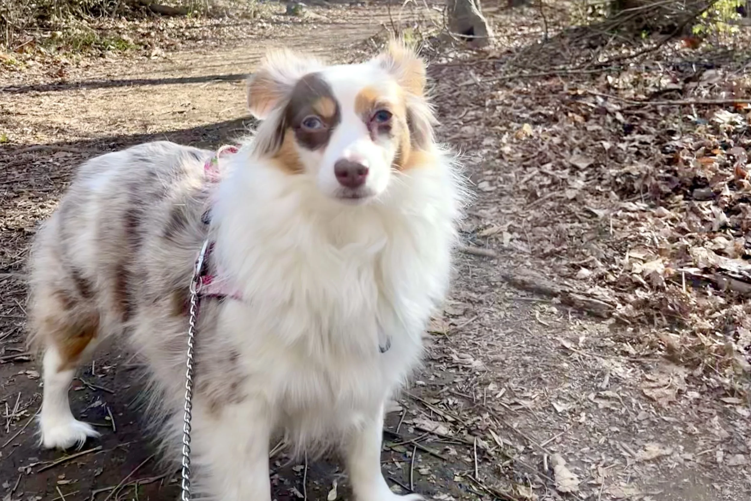 Sadie pauses during a walk, scanning the environment before deciding whether to move forward.
