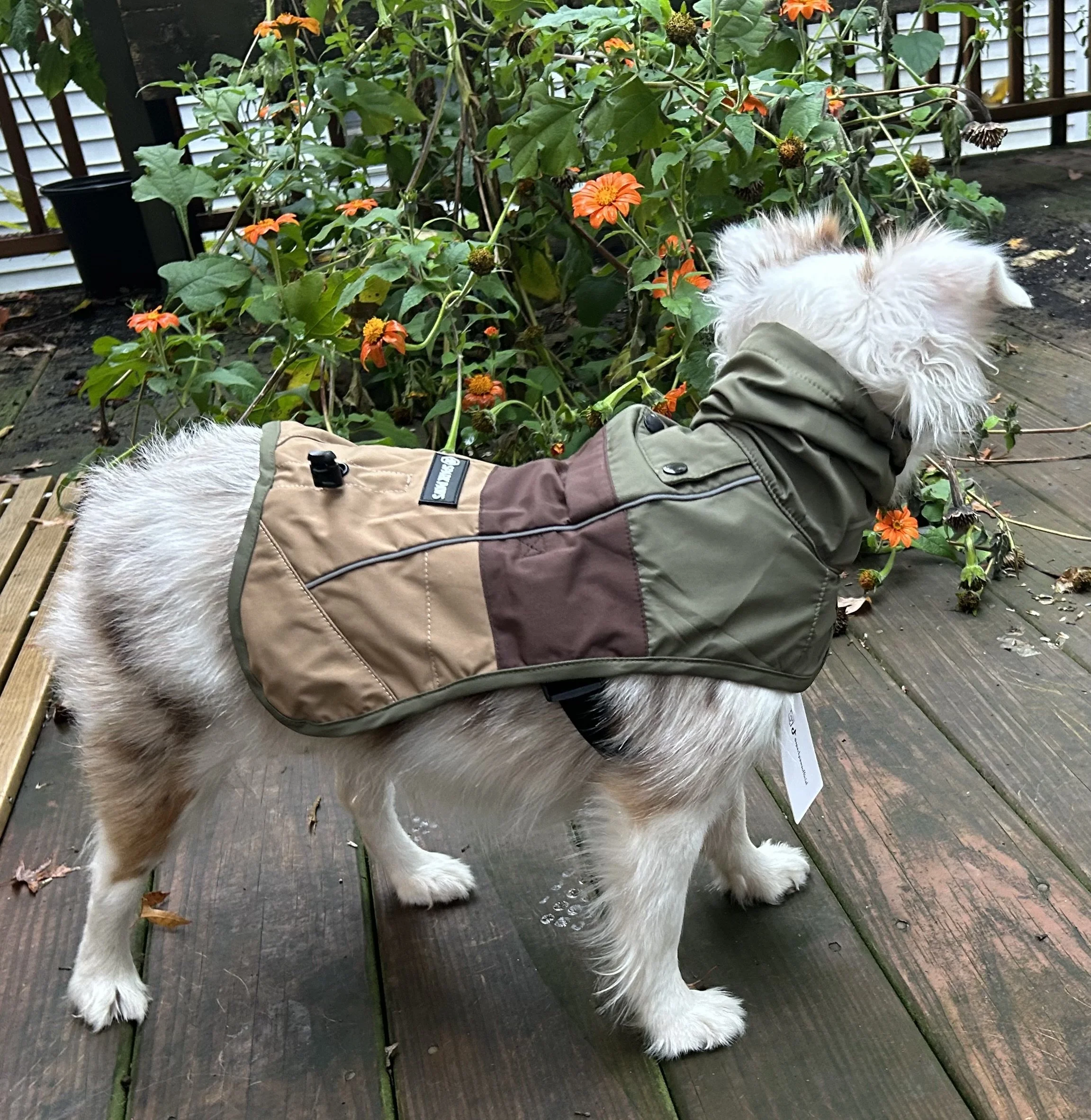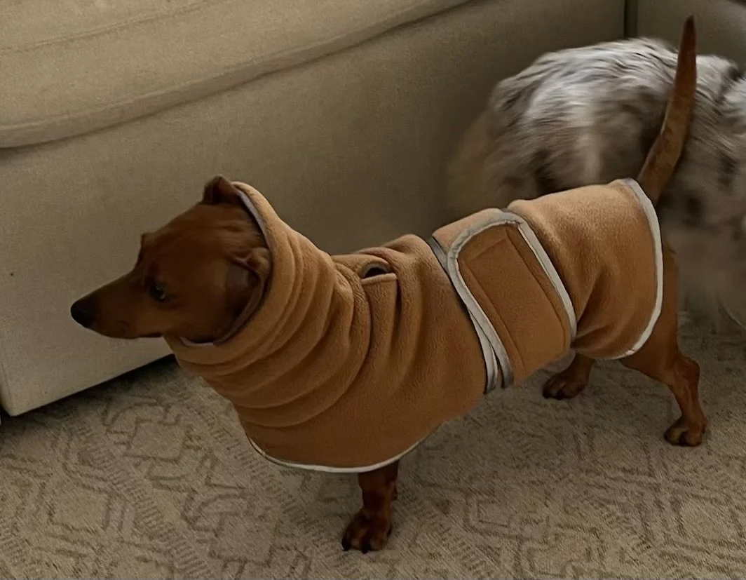 Then there’s Archie, my young, spirited pup who’s resistant to handling. He simply won’t tolerate anything going over his head or having his legs guided into position. For him, a **double Velcro jacket—with one closure under the chest and another under the belly—**has been the best solution. It’s quick to put on, doesn’t force him into uncomfortable positions, and keeps him happy and cozy on walks.