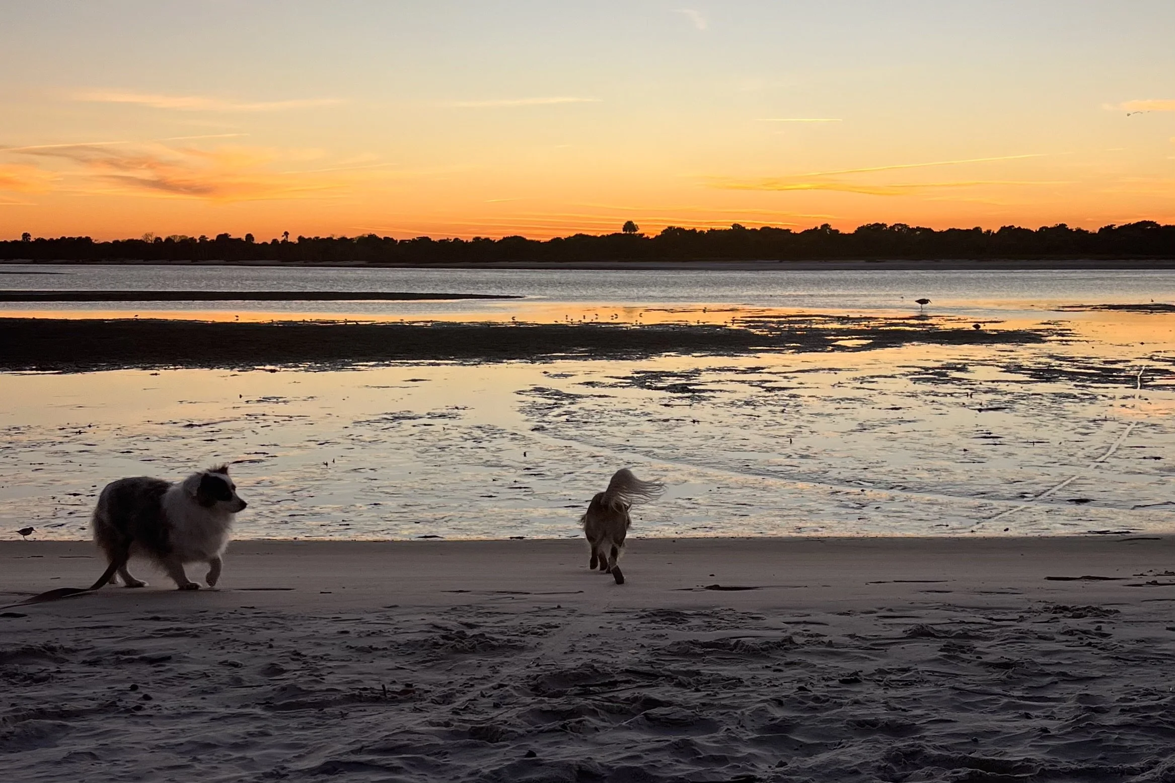 On 30-foot leashes, they ran — not frantic, just free. They waded at the shoreline and chased birds.