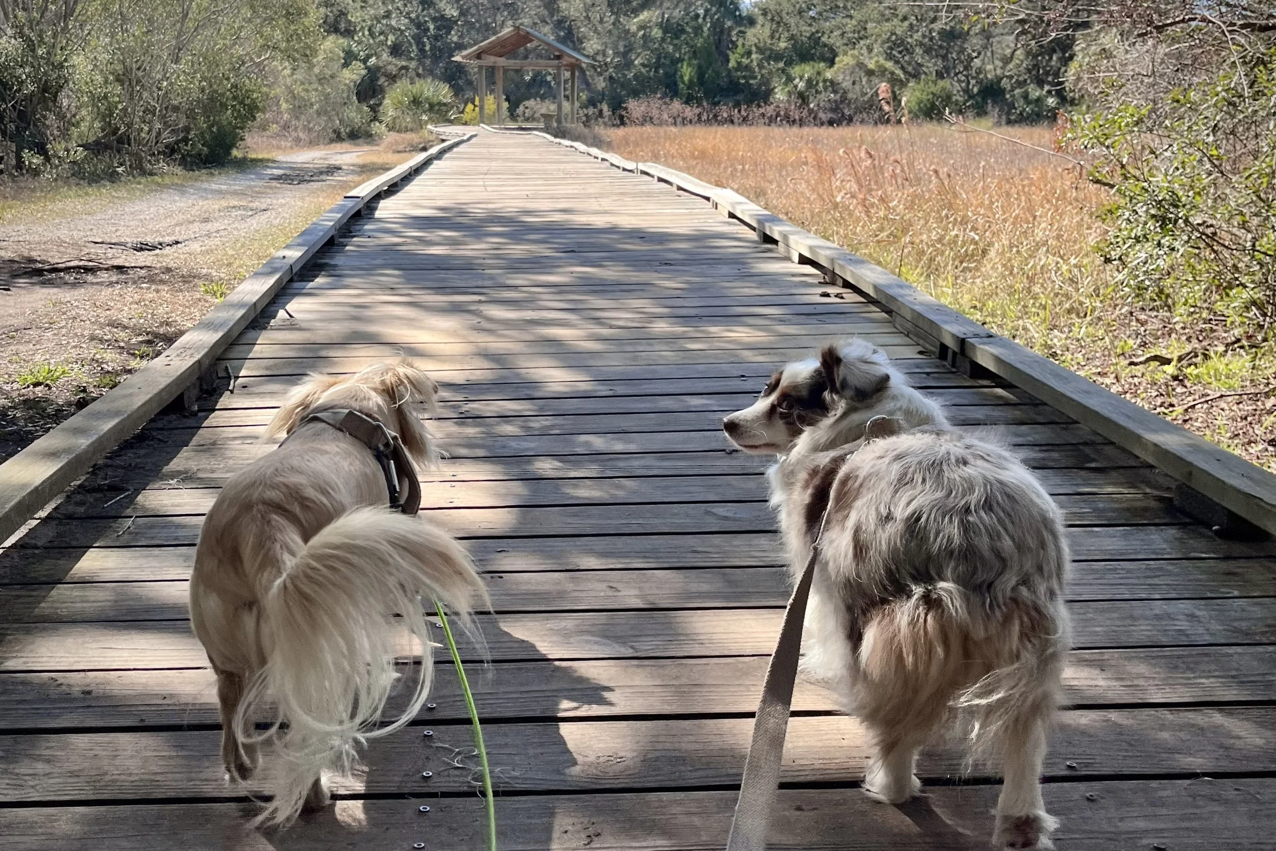 A clearly defined path and open sight lines made this stretch of boardwalk feel steady and predictable for both dogs.